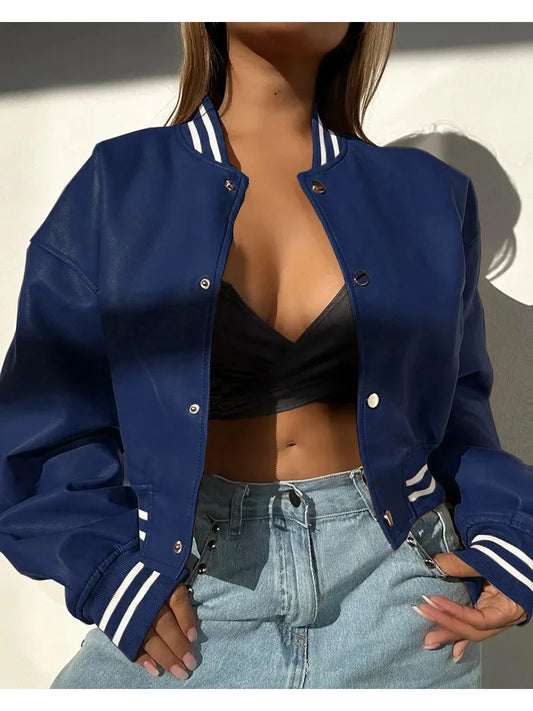 Chaqueta corta Sexy de piel sintética con cuello vuelto, decoración de botones a la moda, abrigo de PU, abrigos informales de calle Vintage para mujer