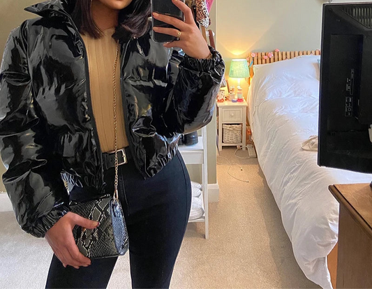 chaqueta para mujer con cremallera Manga larga Brillante Pu Grueso Cárdigan Abrigo Mujer