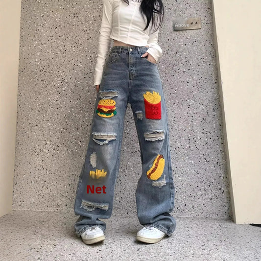 Pantalones vaqueros holgados para mujeres, ropa de calle americana, azul claro, lavado, moda de calle