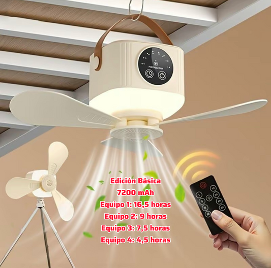 Ventilador de techo portátil silencioso con luz LED y ventilador, recargable
