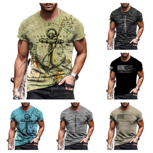 Summer retro flag print men's t-shirt fashion loose short-sleeved sports t-shirt breathable t-shirt 6xl