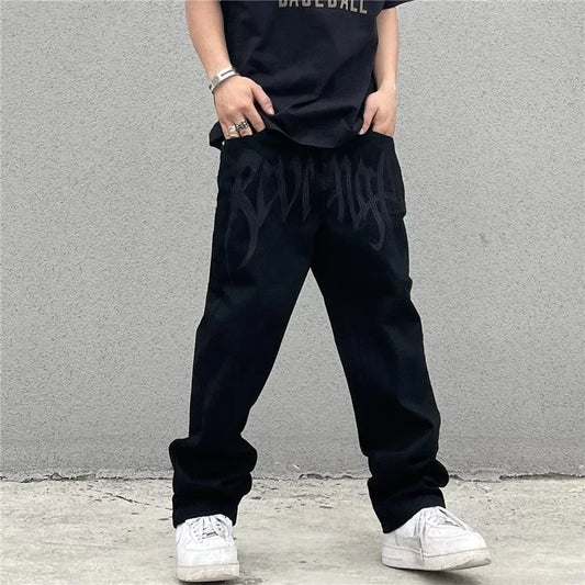 Nouveau jean baggy noir pour homme, streetwear américain rétro avec lettres brodées